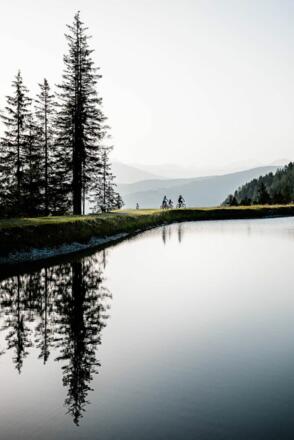 Los geht es an der Talstation des Ski- und Wandergebietes Schlick 2000 in Fulpmes. Nach wenigen Metern auf Asphalt zweigt der Forstweg zur Mittelstation Froneben ab, und es heißt teilweise recht steil bergauf treten bis der Panoramasee und die Kalkkögel vor einem liegen. Hier werden Biker für ihre Stramplerei belohnt, müssen dann aber unbedingt noch einen Abstecher zur Schlicker Alm mit gemütlicher Terrasse machen. Chillig geht es dann die letzten Höhenmeter zur Galtalm, und es rollt sich entspannt über die Bruggeralm und die Fronebenalm zurück ins Tal.
