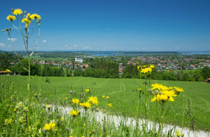 Der „Alte Salinenweg“ ist ein Panoramaweg, der immer wieder Ausblicke auf Bernau, den Chiemsee und die Berge frei gibt.