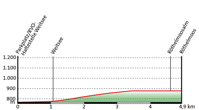 Weg: leichte WanderungAusgangspunkt: Weitsee/Röthelmoos  mit dem Linienbus oder Wanderbus erreichbarAuf ebenem Weg am Bachlauf entlang zwischen Kien- und Tempelberg geht die Wanderung zur Röthelmoos-Alm ( Weg Nr. 49 ). Nach einer knappen Stunde weitet sich das Tal, und eine Rasthütte mit Brunnen lädt zum Verschnaufen ein.Der Weiterweg geht entlang des Hochmoores zu den Röthelmoos - Almen (894m).Besonderheiten: Hochmoor mit der Flora eines Moor-Schutzgebietes. Am Ende des Wanderweges bzw. Weiterweg nach Ruhpolding befindet sich die "Röthelmoosklause" ein zur Holztrifft errichtetes Kulturdenkmal, 250 Jahre alt. Im Bereich der Almfläche schöne Aussicht zur Gurnwand und Hörndlwand.Einkehr: Langerbaueralm und Dandlalm mit selbst hergestelltem Käse.Tipp: Achtung - die Strecke ist auch ein beliebter Radweg bzw. Mountainbike-Strecke. Nach der Wanderung Bademöglichkeit an den Seen..
