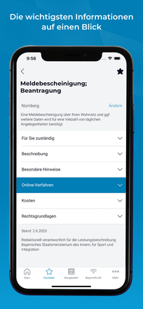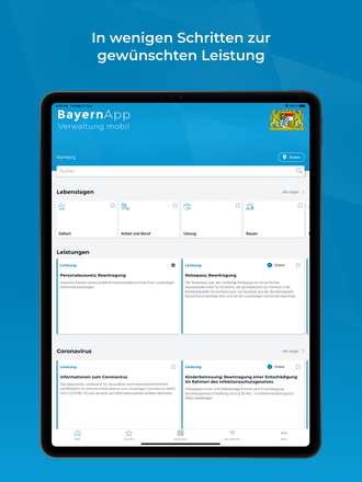 Die BayernApp bietet Bürgerinnen und Bürgern einen mobilen Zugang zu staatlichen und kommunalen Verwaltungsleistungen in Bayern. Sofern die zuständige Behörde einen Online-Antrag bereitstellt, können Sie diesen direkt aus der App heraus starten. Außerdem erhalten Sie über die BayernApp Neuigkeiten zu verschiedensten Themen und eine Karte zeigt Ihnen kostenfreie BayernWLAN-Hotspots in der Umgebung.