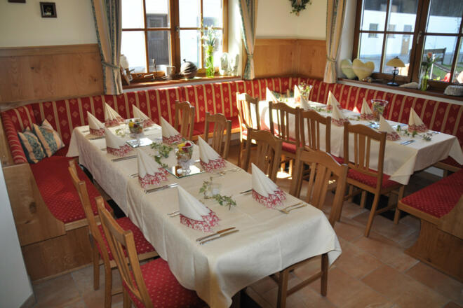 Genießen Sie das abwechslungsreiche und reichhaltige Frühstücksbuffet mit verschiedenen hausgemachten Marmeladen, Butter, Nutella,Honig, Eier, Joghurts, Müslis, Wurst- und Käse aus der Region, Säften frischegebackenen Semmeln, Bauernbrot und vielem mehr.