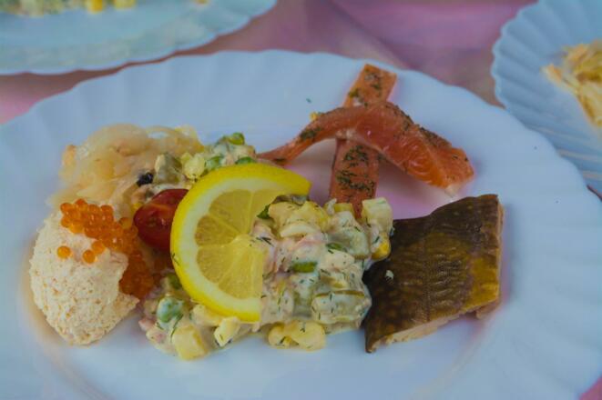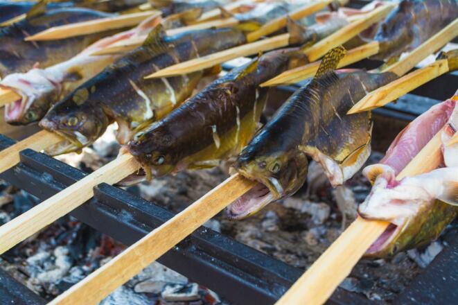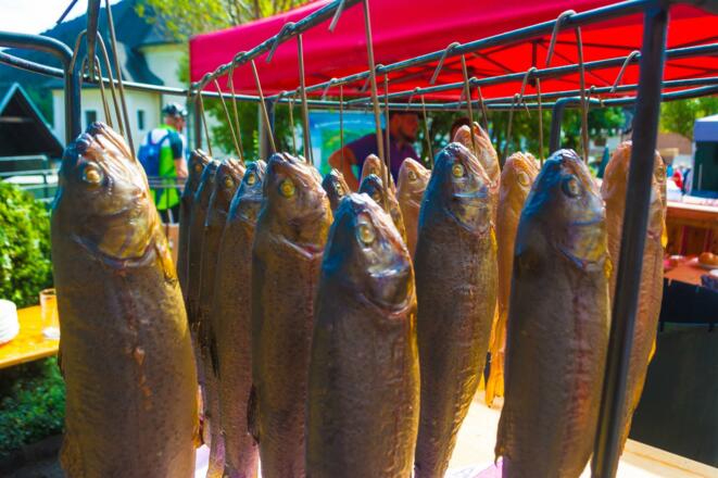 Lokale Köstlichkeiten vom heimischen Fisch wie Fischsuppe, Paella, Kärntna Laxn, Fischnudeln, Fisch-Wraps, Hecht, Steckerlfisch, Fischburger, Bachsaibling, Lachsforelle, Huchen, Pizza Calzone vom heimischen Fisch, Räucherforelle, Smokey fish & cheese, Fischpasta u.v.m.