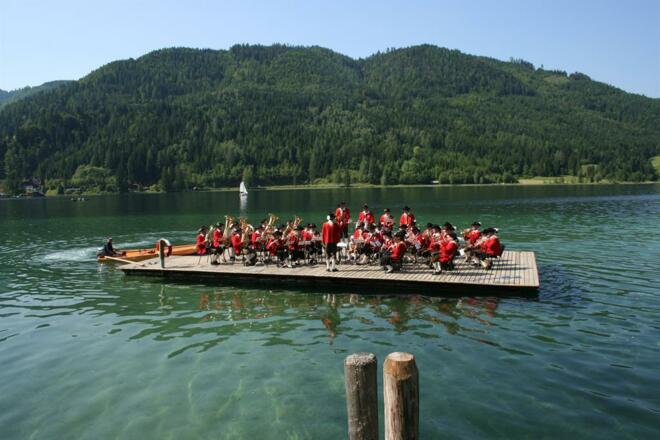 Floßkonzert der Trachtenkapelle Weissensee. Von Neusach nach Techendorf. Beginn 20.00 Uhr.