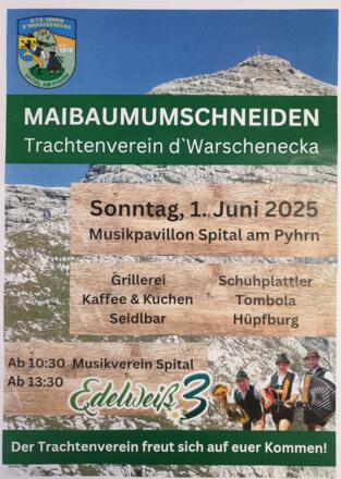 Vormittag Frühschoppen mit der Trachtenmusikkapelle Spital am Pyhrn. "Edelweiß 3" unterhalten euch am Nachmittag. Zwischendurch gibt es Schuhplattler-Einlagen und Maibaum-Umschneiden. Große Tombola mit schönen Preisen. Hüpfburg.