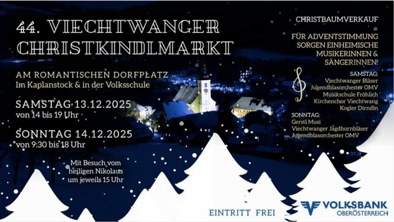 Am romantischen Dorfplatz, im Kaplanstock und in der Volksschule präsentieren sich am Viechtwanger Christkindlmarkt wieder regionale AusstellerInnen mit wunderbarem Handwerk und natürlich dürfen sich BesucherInnen auch auf kulinarische Köstlichkeiten aus dem Almtal freuen.
