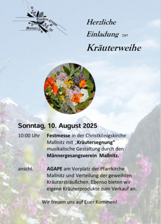 10:00 Uhr Festmesse in der Christkönigskirche mit "Kräutersegnung", musikalische Gestaltung durch den Männergesangsverein Mallnitz,