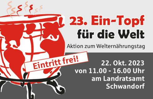 Jedes Jahr findet die Veranstaltung "EinTopf für die Welt", organisiert vom Agende-21-Arbeitskreis des Landkreises Schwandorf mit Schirmherrn Landrat Thomas Ebeling, in der Kantine des Landratsamtes anlässlich des Welternährungstages statt. Am Sonntag, 19.10. (11:00 - 16:00 Uhr) ist es wieder soweit. In unserer Kantine werden neben internationalen Spezialitäten aus Brasilien, Türkei und Indonesien auch wieder frisch gepresster Apfel- und Quittensaft angeboten. Zudem gibt es neben den kulinarischen Highlights aus aller Welt auch Live-Musik ab 11.30 Uhr von "Kitchenrock", Tanzeinlagen, Kinderschminken und vieles mehr. Der gesamte Erlös der Veranstaltung wird gespendet und kommt in diesem Jahr dem REINBOW HOUSE OF HOPE UGANDA (RHU) zugute. Gerne laden wir alle recht herzlich zu dieser tollen Veranstaltung ein und freuen uns auf ein zahlreiches Erscheinen.