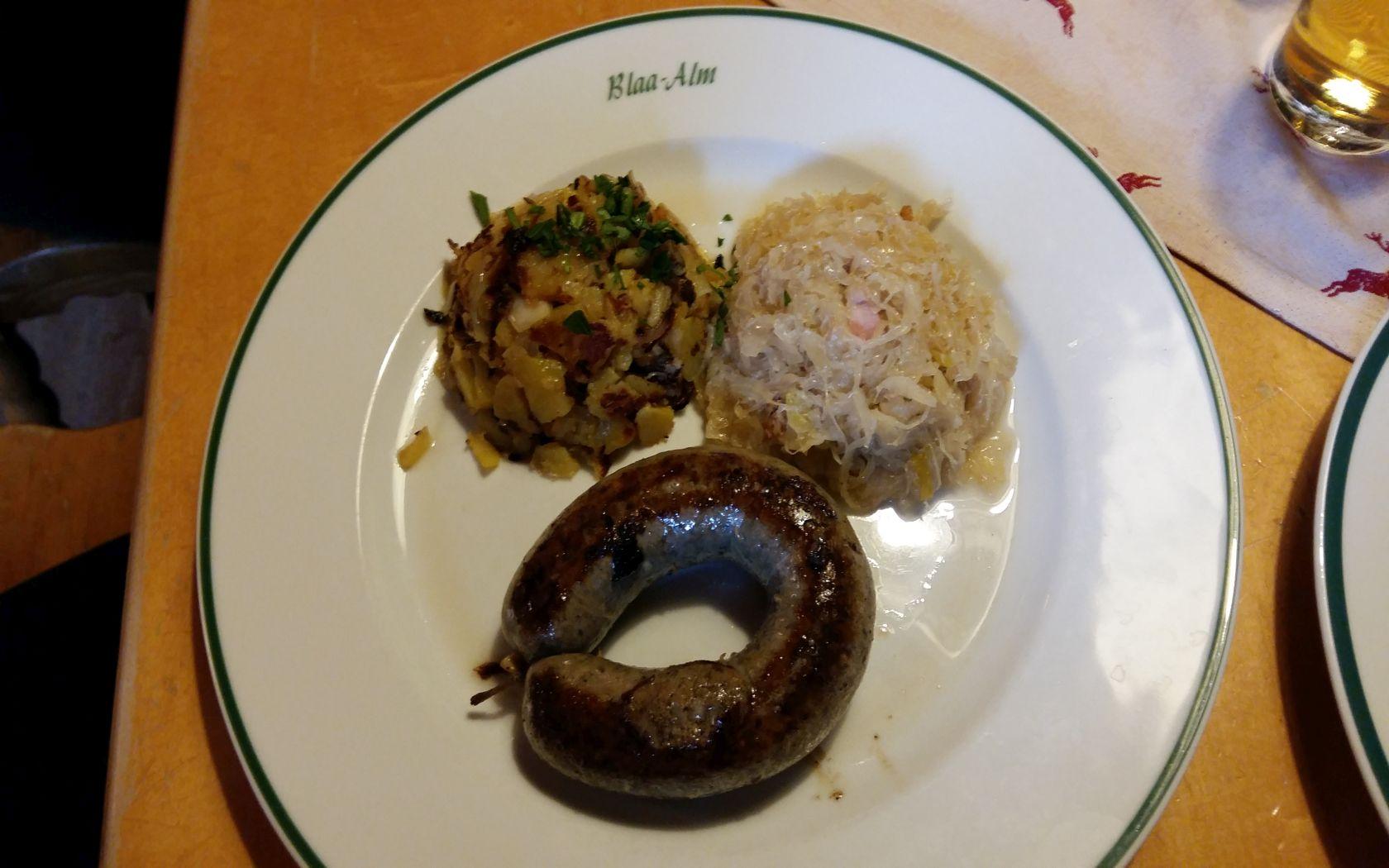 Nach dem Besuch der Kripperlausstellung mit kleinem Weihnachtsmarkt im ersten Stock werden in der gemütlichen Gaststube verschiedene Wurst-Gerichte serviert. Selbstverständlich stehen auch bodenständige Gerichte (Blaa Alm Schnitzel, Käsespatzen usw.) auf der Karte.