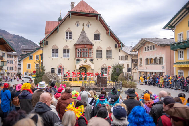Stage carnival and parade of the St. Gilgen fools on Mozartplatz.