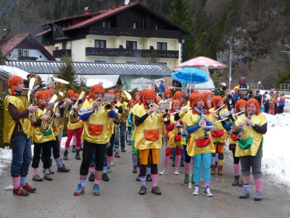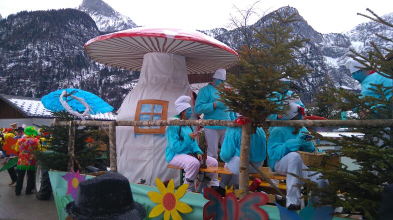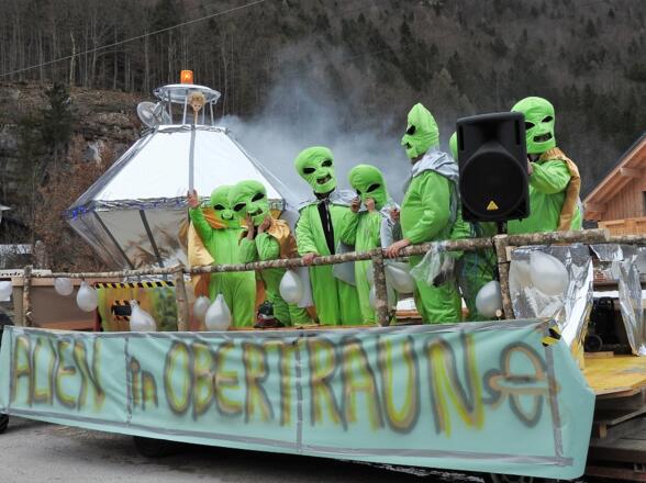 Unter Begleitung der Ortsmusikkapelle Obertraun ziehen die einzelnen Faschingsgruppen, großteils mit aufwändig gestalteten Wägen durch den Ort zum Obertrauner Gemeindeamt, natürlich mit Ausschank am Gemeindeplatz!