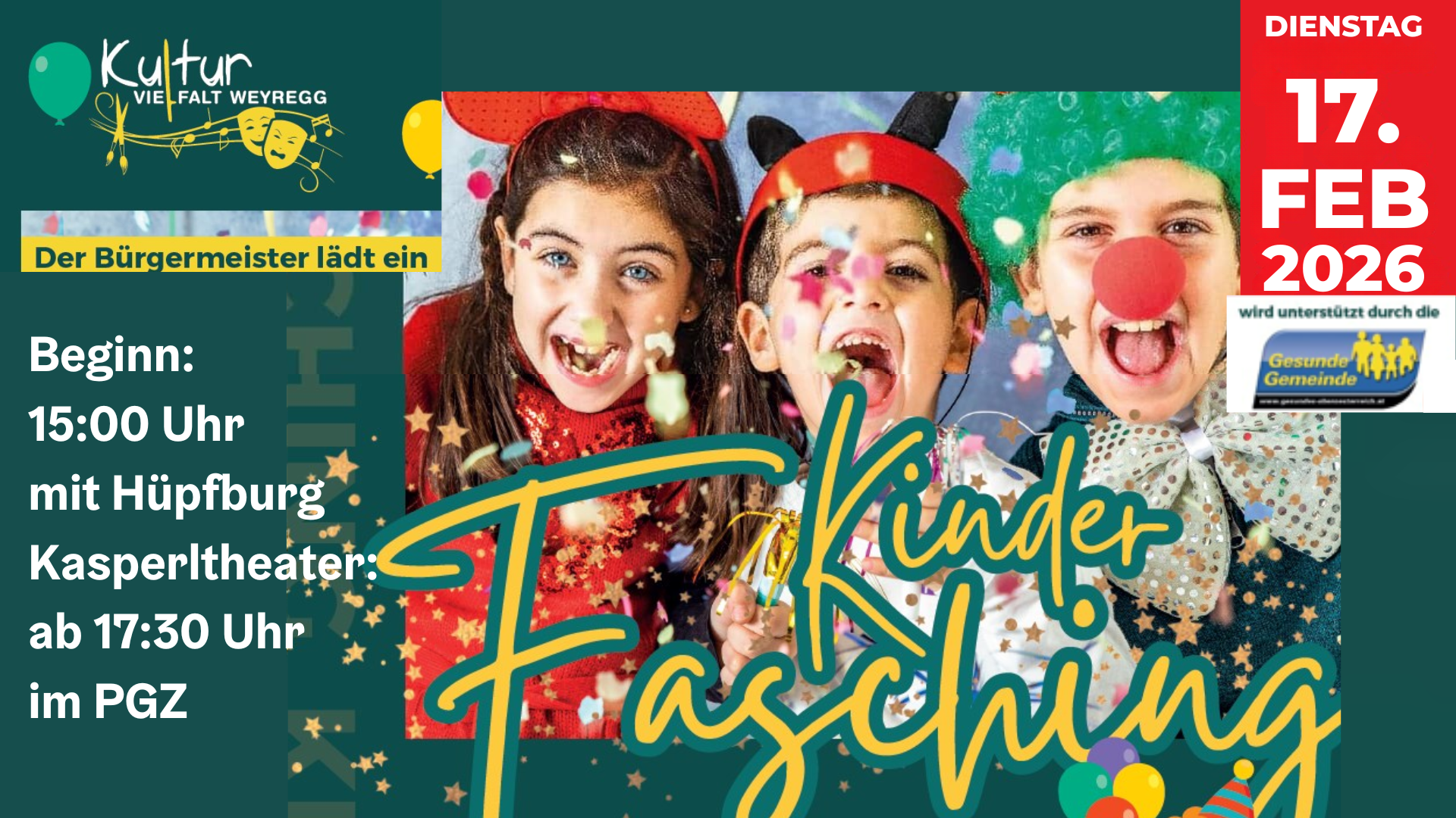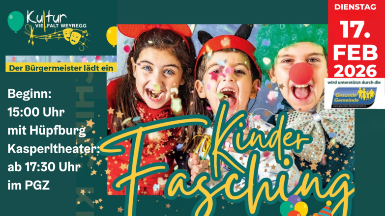 Der Bürgermeister lädt alle Kinder zum Kinderfasching in das Pfarr und Gemeindezentrum ein.