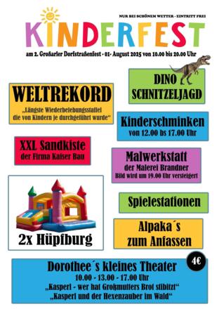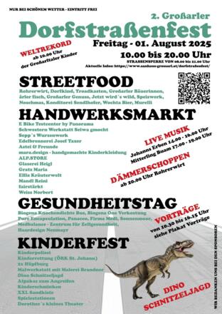 Wir laden herzlich zum 2. Großarler Dorfstraßenfest ein. Ab 10.00 Uhr erwarten Sie Streetfood, ein Handwerksmarkt, das Kinderfest und ein spannender Weltrekordversuch. Ab 10.30 Uhr finden Vorträge zum Thema Gesundheit statt. Für musikalische Unterhaltung sorgen Johanns Erben und die Mitterling Buam und um 20.00 Uhr beginnt das Dämmerschoppen beim Rohrerwirt. Das umfangreiche Kinderprogramm bietet spannende Einblicke an Stationen der Polizei und des Österreichischen Roten Kreuzes, sowie Hüpfburgen, Kinderschminken und vieles mehr. Die Veranstaltung findet nur bei Schönwetter statt. Eintritt frei.