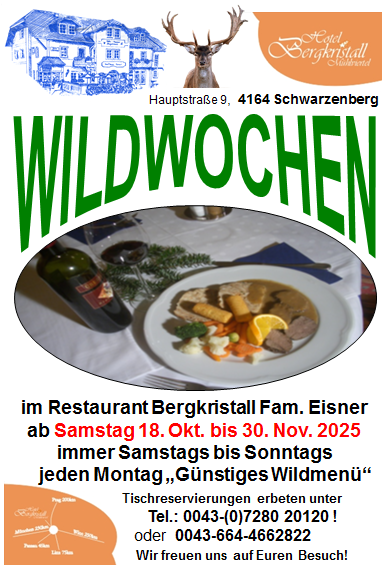 Wildwochen im Restaurant Bergkristall von Samstag 18. Oktober bis 30. November 2025 immer Samstags bis Sonntags. Jeden Montag gibt es ein "günstiges Wildmenü".