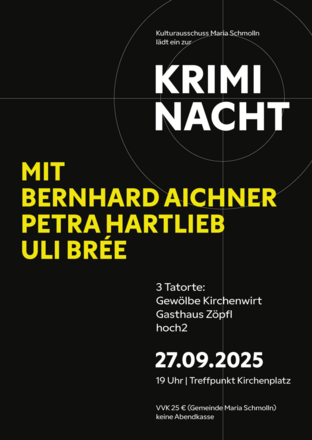 Zum 5. Mal findet die Kriminacht in der Schmolln statt. 3 „Tatorte“ (hoch², Gasthaus Zöpfl, Kirchenwirt) und 3 Krimiautoren. 150 Krimibegeisterte wandern in 3 Gruppen von Tatort zu Tatort. Spannende Geschichten und kulinarische Begleitung machen die Veranstaltung zu einem Erlebnis.