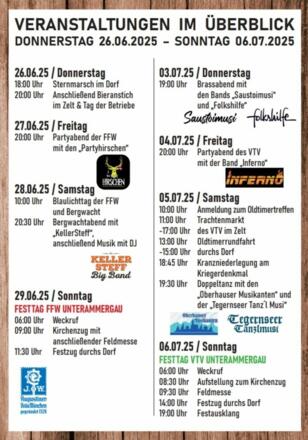 05.7.25: 10.00 Uhr Anmeldung zur Oldtimerfahrt, 11.00-17.00 Uhr Trachtenmarkt im Festzelt mit musikalischer Umrahmung, 13-15 Uhr Oldtimerrundfahrt durchs Dorf, 18.45 Uhr Kranzniederlegung am Kriegerdenkmal, 19.30 Uhr Doppeltanz mit den "Oberhauser Musikanten" und der "Tegernseer Tanzlmusi"