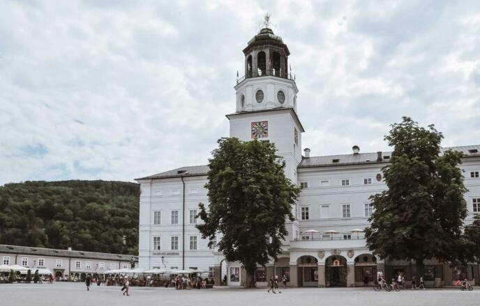 Unter dem Helm des Turmes an der Westseite der Neuen Residenz befindet sich das Salzburger Glockenspiel.