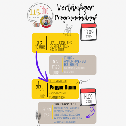Traditionelles Dorfplatteln ab 15:00 Uhr bis 17:00 Uhr, 17:00 Uhr Ankommen beim Areal des Campingplatzes HOCHoben camp&explore, ab 17:30 Uhr Böhmische Musik im Partyzelt, ab 20:00 Uhr Zeltfest mit den "PAGGER BUAM", anschl. Plattlerdisco