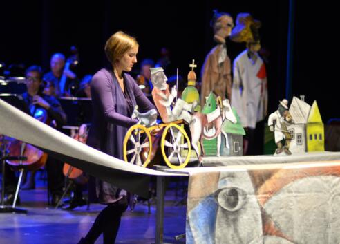 Modest Mussorgski komponierte seine Bilder einer Ausstellung, nachdem er Zeichnungen und Bühnenentwürfe eines Freundes gesehen hatte, also als Musik zu Bildern. Die Figuren von Karin Schäfer spüren diesen Eindrücken nach und schaffen damit eine ganz eigene Ausstellung auf der Bühne, mit Licht, faszinierenden Projektionen und Bewegungselementen.