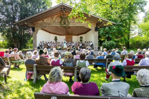 Die Blaskapelle Lenggries spielt ein abwechslungsreiches und facettenreiches Programm im Kurgarten an der Stefan-Glonner-Straße - bei schlechtem Wetter im Alpenfestsaal.