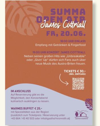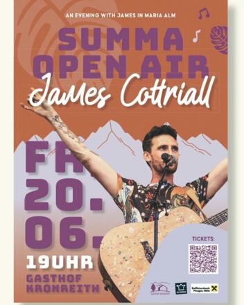Am 20. Juni 2025 sorgt Singer-Songwriter James Cottriall beim Summa Open Air beim Gasthof Kronreith in Maria Alm für unvergessliche Momente. Mit seiner gefühlvollen Stimme und seinen eingängigen Songs schafft er eine Atmosphäre, die berührt und begeistert.