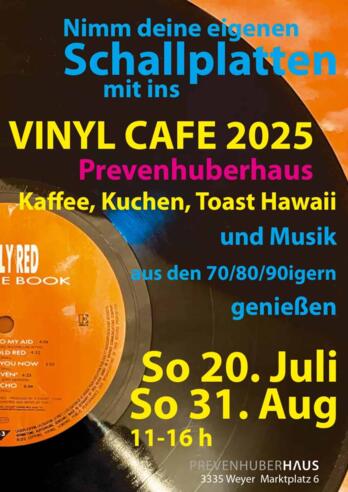 Nimm deine alten Schallplatten und komm ins Prevenhuberhaus! Bei Kaffee, Kuchen und Toast Hawaii kannst du deine vielleicht schon länger nicht mehr gespielten Platten hören und Musik aus den 70, 80 und 90iger Jahren genießen, bei Schönwetter im Innenhof. Das Vinyl Cafe bietet dir die Möglichkeit, deine alten Tonträger reinigen zu lassen, zu digitalisieren oder sie los zu werden.
