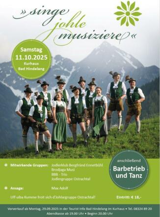Am 11. Oktober 2025 lädt die Jodlergruppe Ostrachtal wieder zu ihrem traditionellen Volksmusikabend „Singe, Johle, Musiziere“ ins Kurhaus Bad Hindelang ein. Die Veranstaltung, die um 20.00 Uhr beginnt, verspricht nicht nur musikalische Höhepunkte, sondern auch einen stimmungsvollen Ausklang mit Tanz und erstmalig auch Barbetrieb!