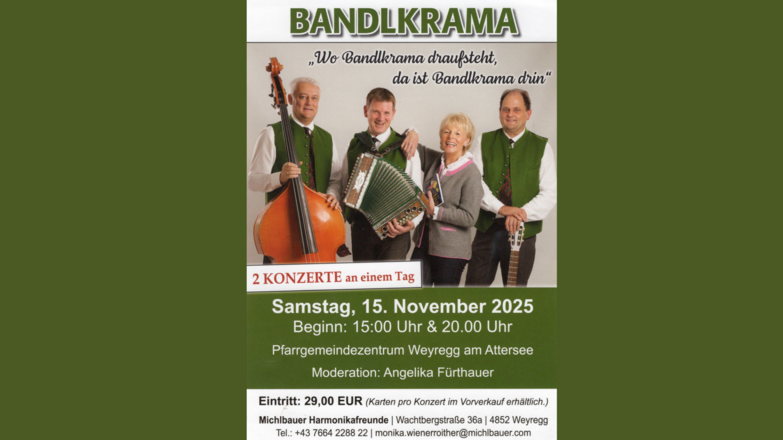 | Preisinformation | Eintritt 29,00 EUR Karten pro Konzert im Vorverkauf erhältlich. Kartenvorverkauf Michlbauer Harmonikafreunde, Monika Wienerroither, T: +43 7664 2288 22, E-Mail: monika.wienerroither@michlbauer.com |