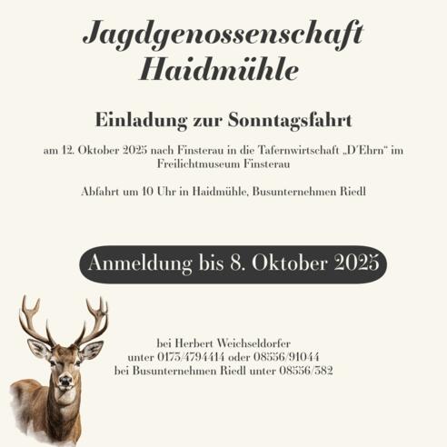 Einladung zum JagdessenHierzu lade ich alle Jagdgenossen samt Begleitung recht herzlich ein und freue mich auf Euer zahlreiches Kommen.Hermann Schuster, Jagdpächter