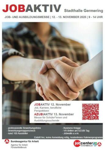 JOBAKTIV & AZUBIAKTIV 2025 - Die Job- und Ausbildungsmesse der Arbeitsagentur Die JOBAKTIV Germering ist die Messe für Job und Ausbildung. Unternehmen verschiedener Branchen können sich im Rahmen der Messe präsentieren und für ihre aktuellen Job- und Lehrstellenangebote werben. Zudem informieren Arbeitsagentur, Jobcenter und Bildungsträger sowie unsere Netzwerkpartner über berufliche Perspektiven und Unterstützungsmöglichkeiten. Jobwalls, ein Rahmenprogramm mit verschiedenen Aktivelementen sowie praxisnahe Vorträge und Workshops runden das Messeangebot ab.Öffnungszeiten:JobAktiv: Mittwoch 12. November, 9:00 – 14:00 UhrAzubiAktiv: Donnerstag 13. November, 9:00 – 14:00 UhrWeitere Informationen: https://www.arbeitsagentur.de/vor-ort/weilheim/jobaktiv-2025-die-messe-der-arbeitsagentur