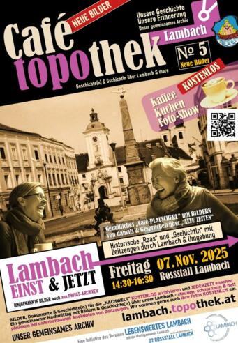 Spannende (un)bekannte Bilder der Topothek Lambach, die zum Schmunzeln, Plaudern und Staunen anregen, gewürzt mit unterhaltsamen Anekdoten von Zeitzeugen aus Lambach. (Un)bekannte Bilder auch aus privaten Archiven. Gemütliches Café-Plauscherl mit Bildern von damals und Gesprächen über vergangene Tage. Die Topothek Lambach ist ein gemeinsames Bürger- und Geschichts-Archiv zum aktuellen Schmökern und zum Archivieren der eigenen Bilder für zukünftige Generationen. Die Bilder können gerne mitgebracht und kostenlos archiviert werden. Die Originalbilder werden an den Überbringer unversehrt retourniert. Somit bleiben wichtige Zeit-, Text- und Bilddokumente für die Nachwelt erhalten und können auf Wunsch auch jederzeit auf der Homepage der lambach.topothek.at betrachtet werden, unabhängig davon, welche erhaltenswerten Archivierungen oder anderweitigen Endlagerstätten die Nachkommen mit den bildhaften historischen Zeit- & Geschichtsdokumenten damit planen. FREIER EINTRITT - Kaffee & Kuchen GRATIS - (solange der Vorrat reicht !)