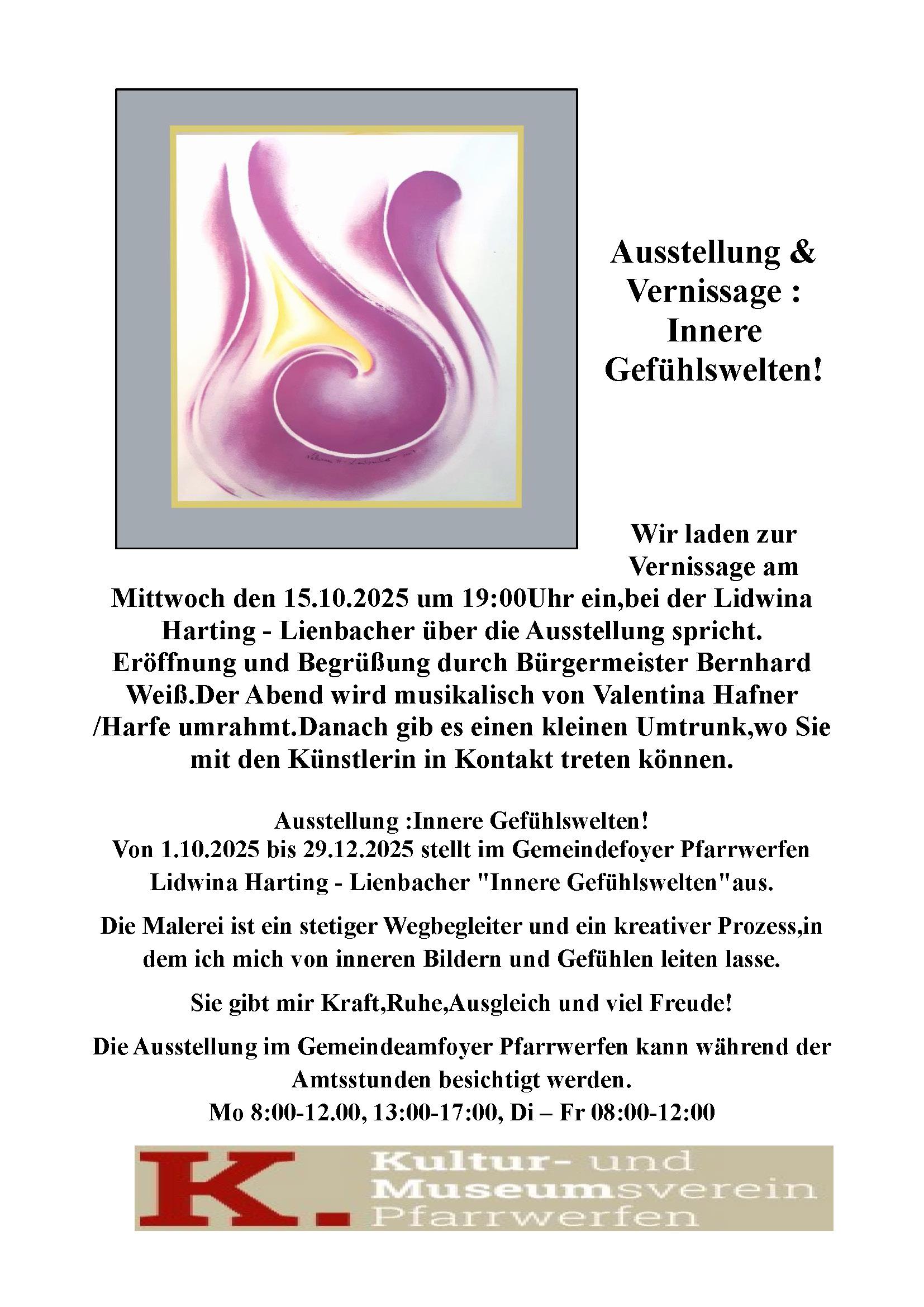 Wir laden zur Vernissage am Mittwoch den 15.10.2025 um 19:00Uhr ein,bei der Lidwina Harting - Lienbacher über die Ausstellung spricht.