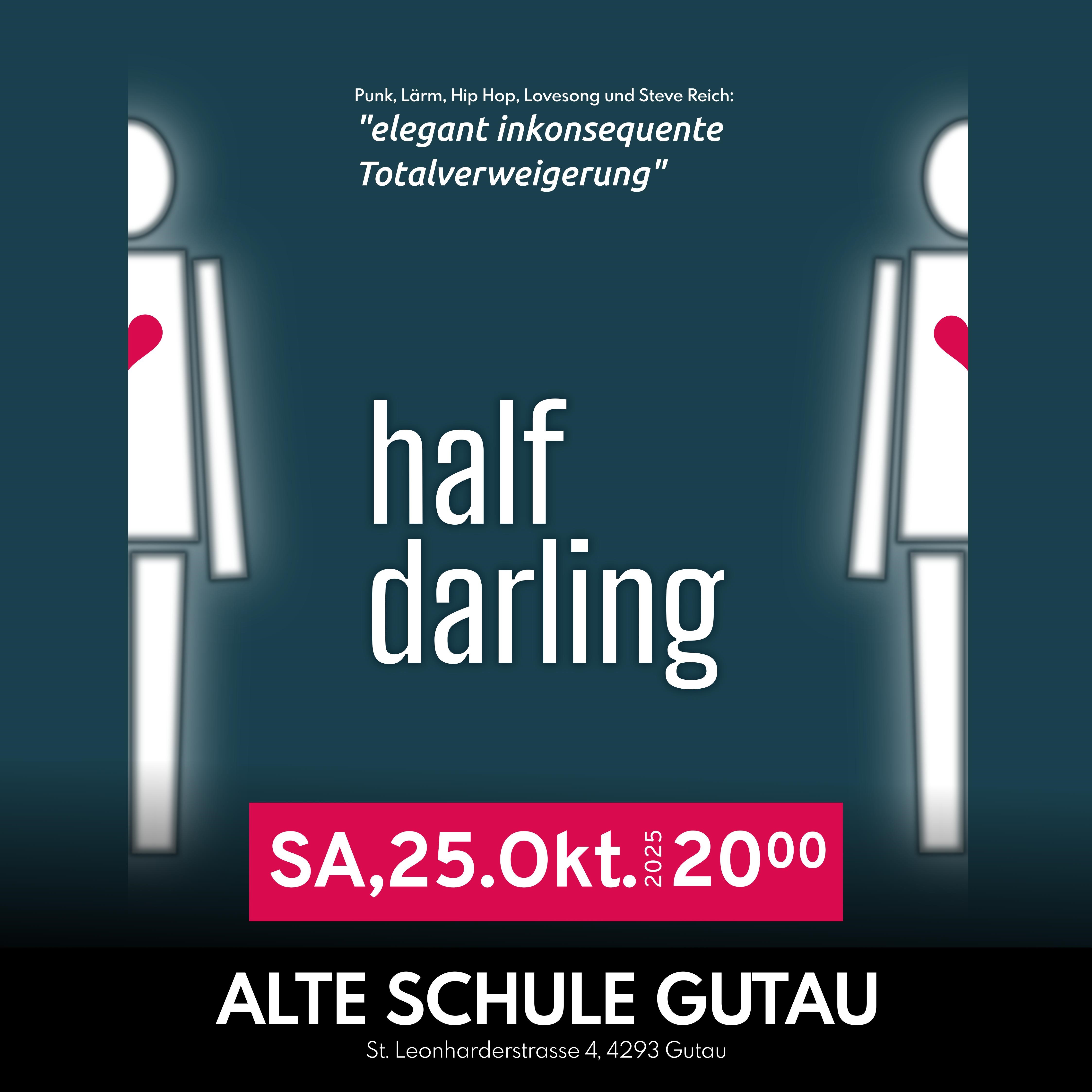 Durch zahlreiche musikalische Verweise werden punktuelle Bezüge hergestellt, die in Summe eine eigenständige, teils irritierende und durchwegs feministisch geprägte Ästhetik ergeben. Die Songs werden von einem hohen Energielevel getragen, wobei die Band den Schwerpunkt auf minimalistische Strukturen, rhythmische Verschiebungen, Irritation und die Intensität der Wiederholung legt. Gemeinsam produzieren HALF DARLING musikalische Kleinode, die Loops, Beats, Riot und popaffinen Hooklines in Spannungsverhältnisse setzen, die den Karren in jeder Kurve an die Wand fahren – einfach weil der Aufprall so schön klingt.