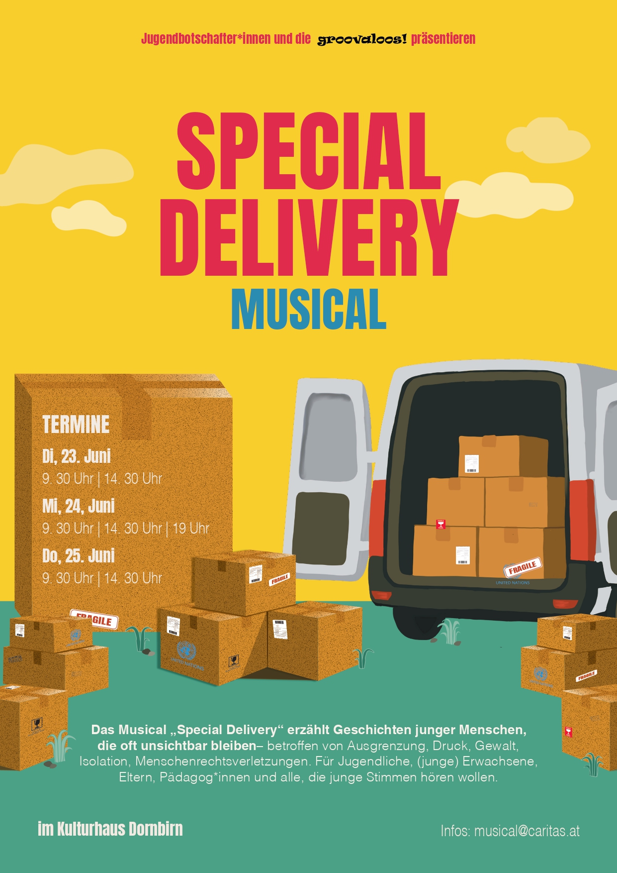 Zielgruppe: Für Schüler*innen der Unter- und Oberstufe! Jugendliche ab 13 Jahren, junge Erwachsene, Eltern und Pädagog*innen. Thematik: SPECIAL DELIVERY ist ein eindrucksvolles Musical über den Blick hinter Fassaden, wo Kinderrechte (die bis zum 18. Lebensjahr gelten) in Österreich von Erwachsenen (meist ungekannt) verletzt und missachtet werden, den wichtigen Dialog zwischen den Generationen – und über die Kraft, Dinge sichtbar zu machen, die leider zu oft übersehen werden. Inhalt: Ein Paketbote und seine 17-jährige Tochter liefern besondere Pakete aus – jedes steht für die Geschichte eines jungen Menschen, oft geprägt von Ausgrenzung, Druck, Gewalt oder andere belastenden Situationen, die im Alltag kaum gesehen werden. Manche davon bleiben meist im Verborgenen – hinter verschlossenen Türen. Schwierige Jugend? Kein Respekt? Nur am Handy? Verwöhnte Generation? Während ihrer Tour sprechen Vater und Tochter über die Kluft zwischen den Generationen, über vorschnelle Urteile und fehlende Vorbilder in der Erwachsenenwelt. Es geht um Missverständnisse, und die Frage: Wer trägt eigentlich Verantwortung, wenn junge Menschen straucheln? Die Tochter erkennt: Es braucht mehr Zuhören, mehr Verantwortung und echtes Interesse an dem, was junge Menschen bewegt. Gemeinsam mit ihren Freund*innen organisiert sie eine Aktion, die wachrüttelt und genau das sichtbar machen soll. Veranstalter: Kinder- und Jugendbotschafter:innen Caritas Auslandshilfe & groovaloos! in Kooperation mit der Kinder- & Jugendanwaltschaft Vorarlberg Veranstaltungsort: Kulturhaus Dornbirn Vorstellungen: Di 23.6. 2026 9:30 und 14:30 Mi 24.6. 2026 9:30 und 14:30 (Abendvorstellung um 19:00) Do 25.6.2026 9:30 und 14:30 Dauer: Das Stück dauert ca. 120 Minuten (mit Pause) Besonderes Extra: Im Foyer gibt es neben dem Informationsmaterial noch einen partizipativen Teil mit großen interaktive „Paket-Boxen“. Die Besucher*innen werden eingeladen für ihre Interessen, Ideen, Engagement, Aktivismus, Partizipation abzustimmen, um sich möglicherweise nachhaltig mit Kinderrechte- relevanten Themen weiterhin auseinanderzusetzen. Preise*: Schüler*innen: 9,00 Euro (2 Begleitpersonen/Schulklasse frei) Erwachsene: 20,00 Euro *Mit den Eintrittspreisen finanzieren wir die Produktionskosten (Kostüme, Verpflegung der Darsteller*innen), Saalmieten & Technik, die ÖSG Gebärdenübersetzung für mehr inklusivere Veranstaltungen die VVVmobil-Pauschale für eure kostenlose Anreise Ein Musical kann nicht die Welt verändern … aber es kann durchaus unsere Wahrnehmung von der Welt verändern und somit auch Einfluss auf unser Handeln nehmen. Die Umsetzung der UN-Kinderrechte geht uns alle was an! Lehrpersonen/Begleitpersonen: Lehrpersonen/Begleitpersonen kaufen die Tickets für ihre Schulklasse. Pro Klasse gibt es max. 2 Freikarten für Begleitpersonen, die NICHT gekauft werden müssen. Nach erfolgter Buchung der Klassentickets bitte das DATENBLATT vollständig ausfüllen: ZUM DATENBLATT Die 2 Freikarten werden bei Ankunft im Kulturhaus direkt ausgehändigt.