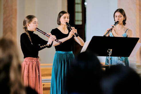 Studierende der Blockflötenklasse Sophia Schambeck an der Stella Musikhochschule musizieren in der Kapelle der Stella.