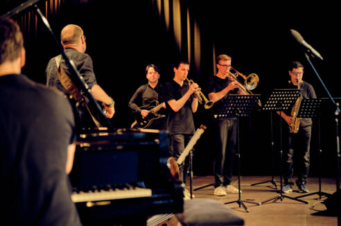 Studierende der Posaunenklasse Krasimir Stefanov an der Stella Musikhochschule musizieren im Kleinen Saal der Stella.