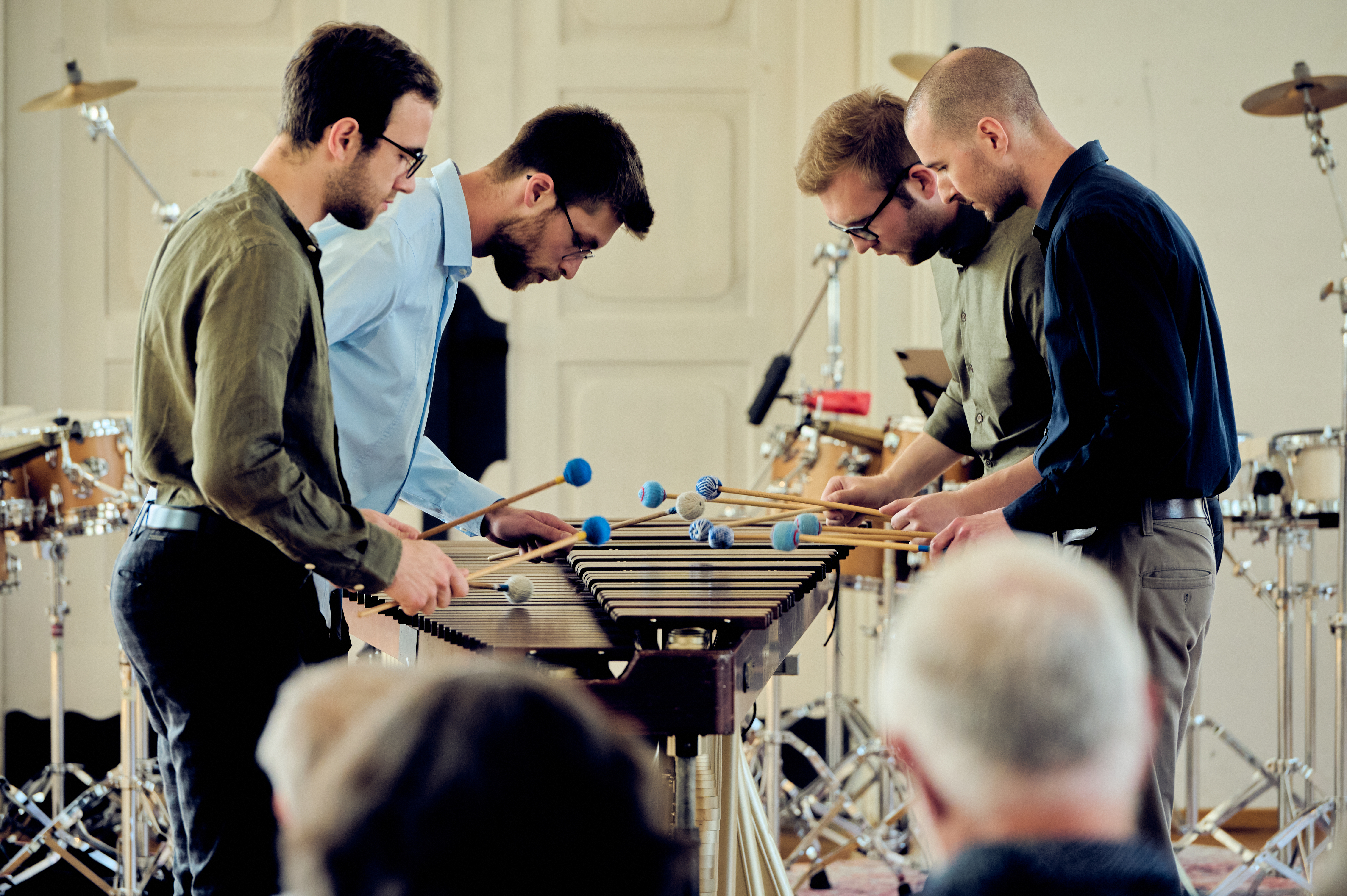 Studierende der Schlagwerkklasse Maximilian Näscher an der Stella Musikhochschule musizieren im Kleinen Saal der Stella.