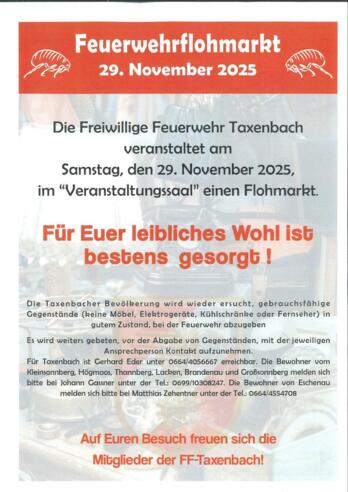 Die freiwillige Feuerwehr Taxenbach veranstaltet am Samstag, den 29. Novemmber 2025 im Veranstaltungssaal einen Flohmarkt.