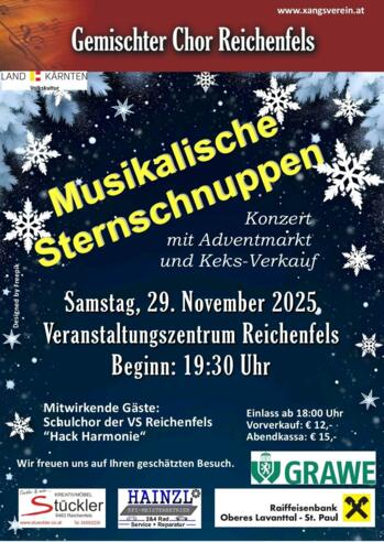 Der Gemischte Chor Reichenfels lädt zum Adventkonzert mit Adventmarkt und Keksverkauf.