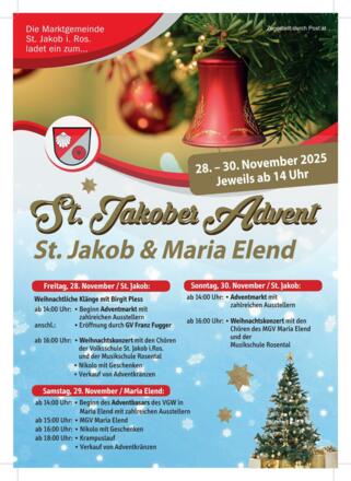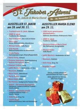 Auch dieses Jahr findet wieder der St. Jakober Advent statt. Am Wochenende vom 28. November bis 30. November 2025 können Sie an 2 Tagen in St. Jakob den St. Jakober Advent und an einem Tag den Adventbasar des VGW in Maria Elend besuchen und in Weihnachtsstimmung kommen.