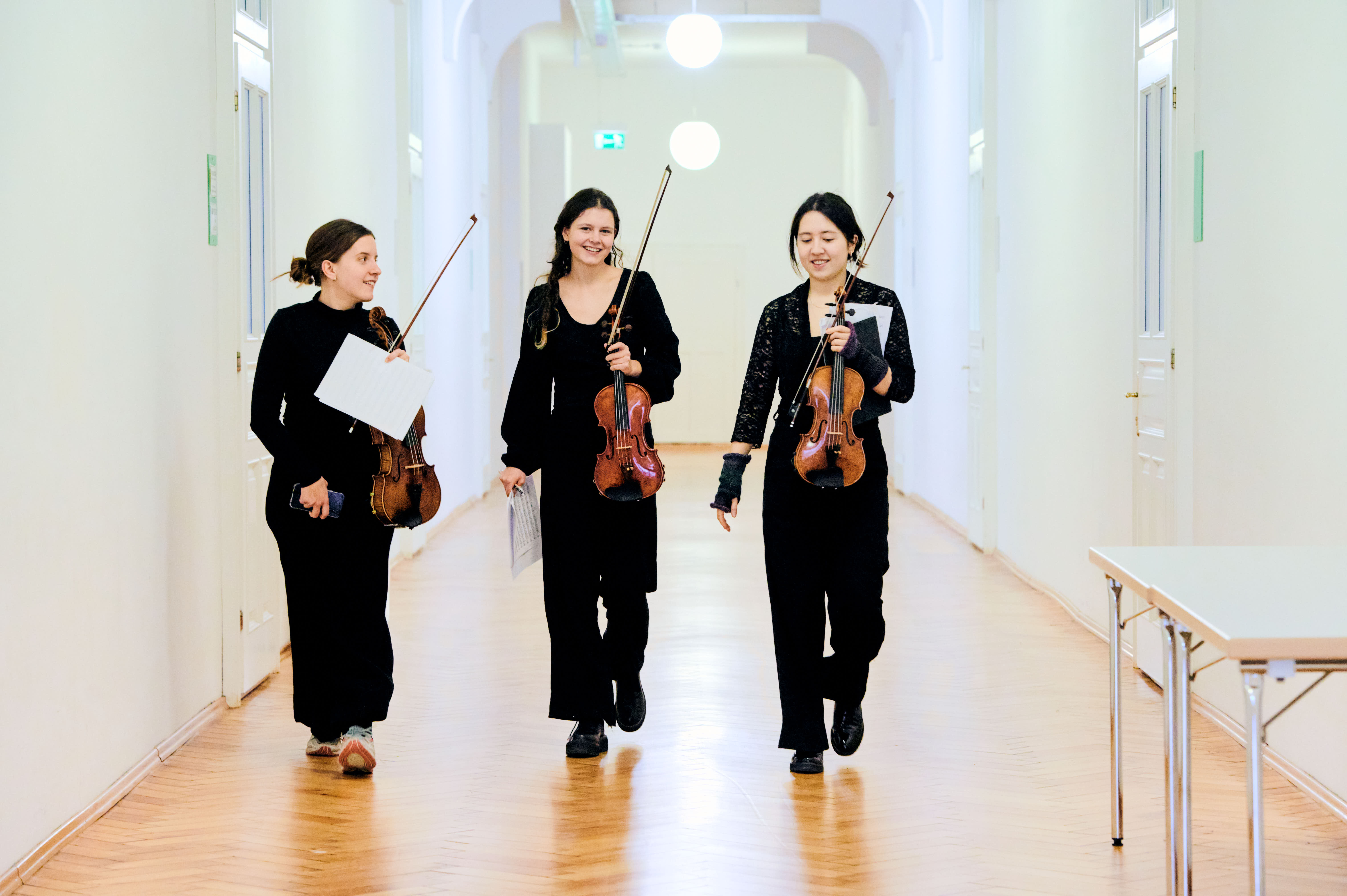 Studierende der Violinklasse Sophie Heinrich an der Stella Musikhochschule musizieren im Kleinen Saal der Stella.