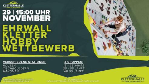Anmeldung per Mail an info@kletterhalle-ehrwald.at oder direkt vor Ort.