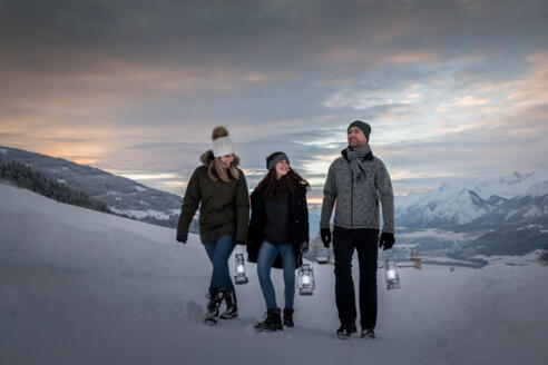 Lassen Sie sich verzaubern von den Lichtern der Laternen bei einer romantischen Wanderung durch die winterliche Bergidylle am Weerberg.
