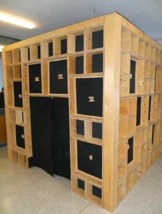Dieser begehbare Adventkalender wurde 2005 vom Künstler und Werklehrer Gerald Bogner mit seinen Schülern im Gymnasium Rohrbach gefertigt – als Kubus, der an die Formensprache von Keith Haring erinnert.