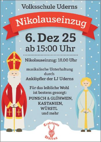 Musikalische Umrahmung durch die Anklöpfler der Landjugend Uderns. Nikolauseinzug um ca. 18.00 Uhr.