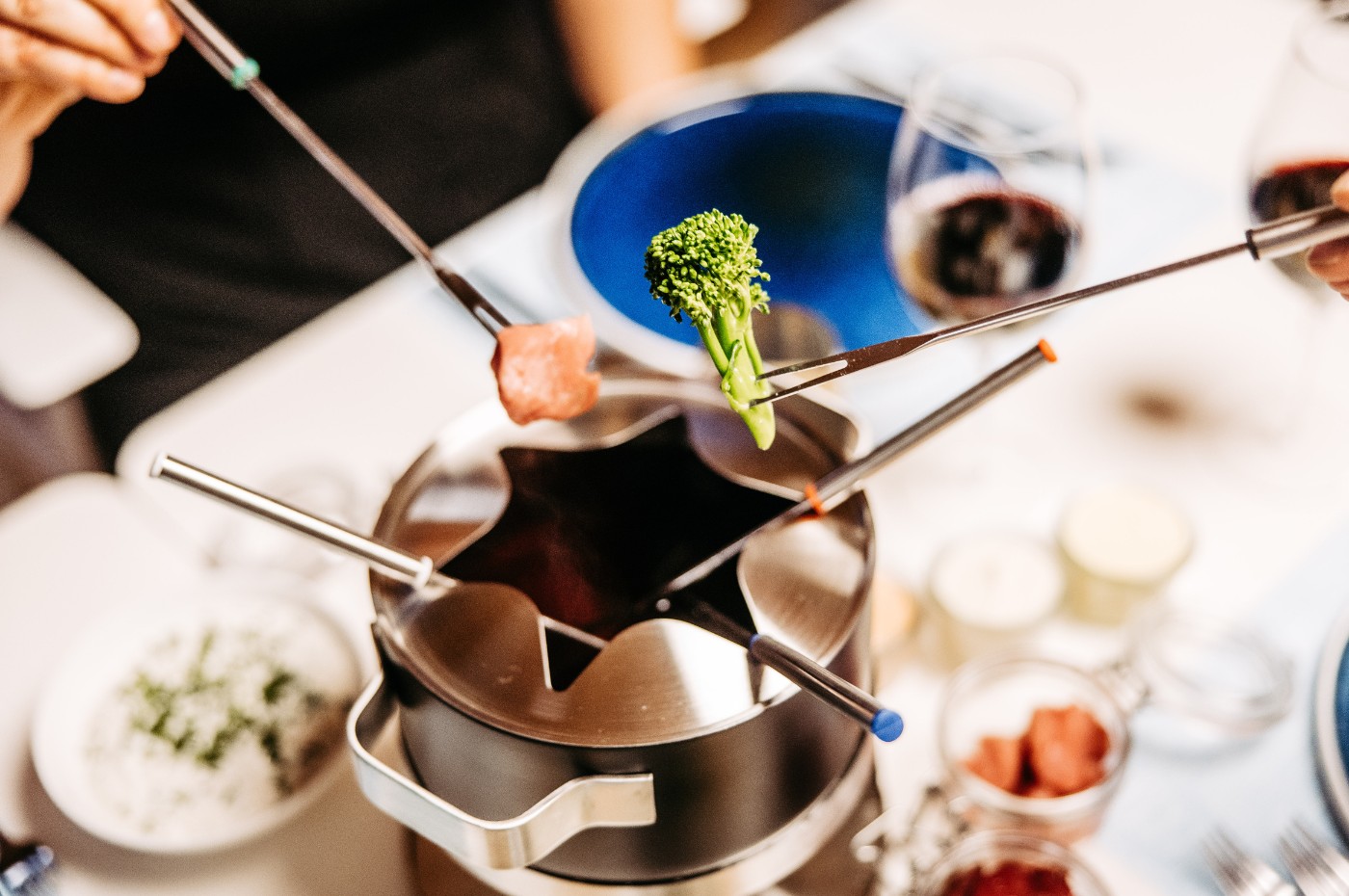 Freuen Sie sich auf ein 3-Gänge-Menü bestehend aus einer Vorspeise, dem Fondue Chinoise mit drei Fleischsorten, Black Tiger Garnelen, verschiedene Beilagen und hausgemachten Soßen sowie einem Dessert.