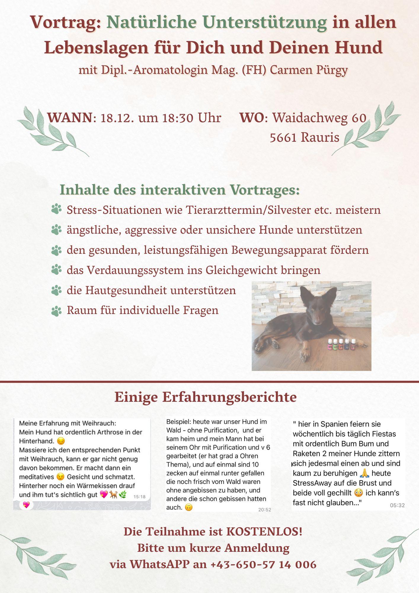 Kostenloser Vortrage über die Natürliche Unterstützung in allen Lebenslagen für Dich und deinen Hund mit Dipl.-Aromatologin Mag. (FH) Carmen Pürgy.