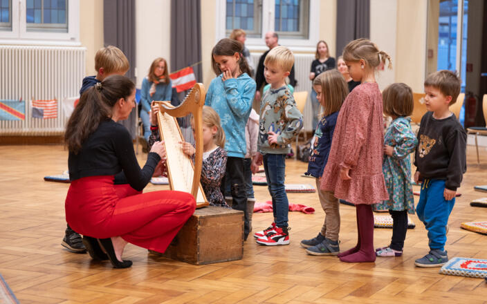 Wie wäre es, die Welt einmal auf einem fliegenden Teppich zu umrunden? Die Harfenistin nimmt ihre Passagiere mit zu einer „Reise um die Welt“. Im Gepäck hat sie Harfe, Schatzkiste, Musik aus verschiedenen Ländern, einige Rätsel und viele Überraschungen. Alle Kinder dürfen auch auf der Bühne mitwirken. Ein Kinderkonzert zum Mitmachen und Träumen, zum Erforschen und Entdecken, zum Erkennen, Verstehen und sich trauen! Seit Jahren begeistert die renommierte Musikerin (31 CDs) europaweit Kinder und Erwachsene mit diesem Konzert auf großen und kleinen Bühnen, in Schulen und Kindergärten. U.a. Schwarzwaldfestival – Moselfestwochen – Landesbühne Esslingen – Sockenkonzerte Köln – Museumsinsel Hombroich – Bodenseefestival – Hohenloher Kultursommer – Interlaken Classics/CH – Villa Musica Mainz – Kronberg Academy Classic for Kids u.v.m.