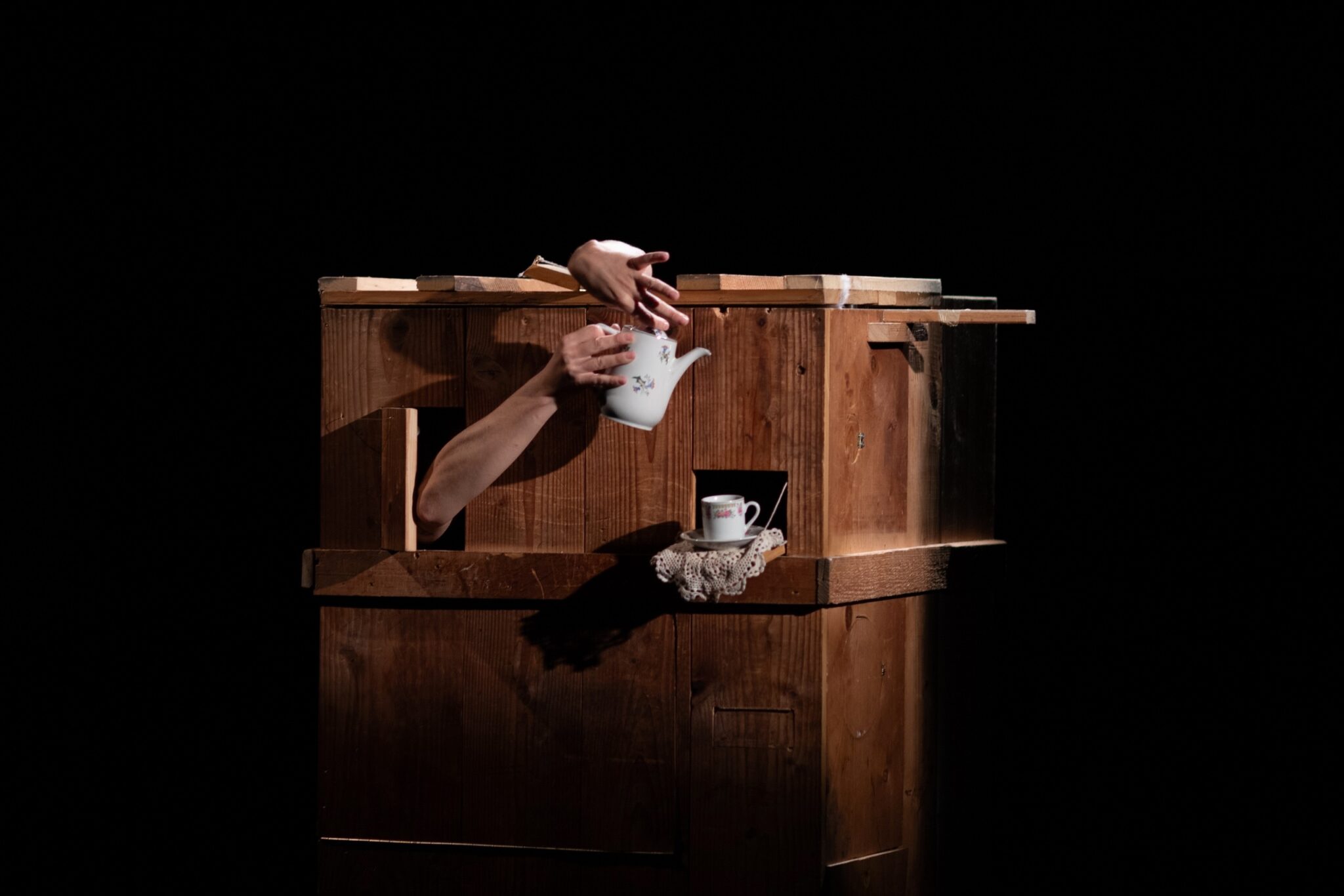 Aus Figuren, Alltagsobjekten und dem Zusammenspiel mit dem menschlichen Körper erwacht aus einer Holzkiste ein szenisches Bestiarium (fast) vergessener Lebewesen: Hausratte, Schmeißfliege, Zitterspinne singen und spielen Geschichten über das Zusammenleben mit Menschen auf engstem Raum.