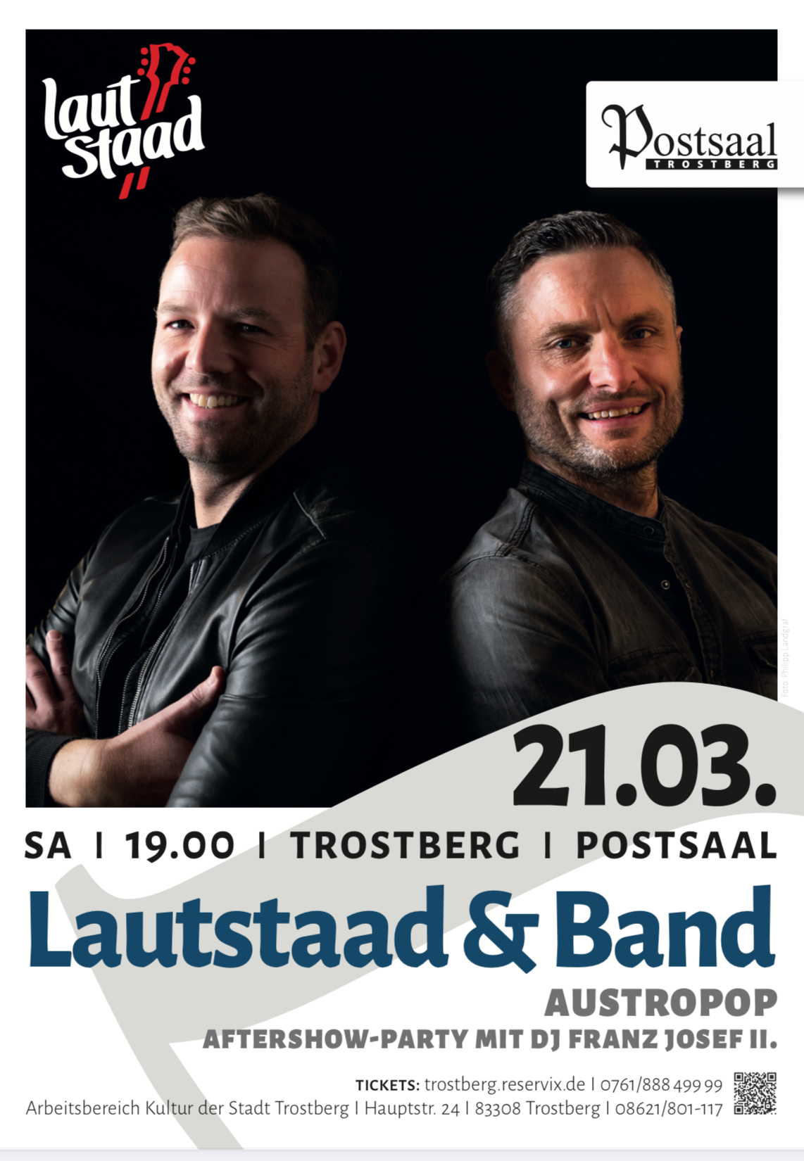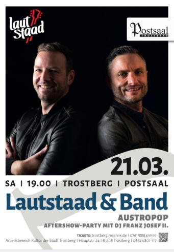 Lautstaad steht für Austropop mit Gfui – mal akustisch, mal mit viel Energie – nun erstmals in voller Bandformation mit hochkarätigen, musikalischen Weggefährten. Gegründet von den Altenmarktern Martin Egner und Dominik Seifert, hat die Formation mittlerweile eine Vielzahl von Konzerten in der Region bestritten und darf sich über eine stetig wachsende Fangemeinde freuen. Im Zentrum stehen die Lieder, Geschichten und Texte der Austropop-Legenden STS, Ambros, Fendrich und Danzer, die das Publikum zum Mitsingen sowie Nachdenken anregen. Aber auch die Songs von Bands wie Seiler & Speer, Pizzera & Jaus, Wanda und Co. kommen nicht zu kurz. Wer nach den musikalischen Live-Eindrücken noch Lust auf mehr hat, für den sorgt DJ Franz Josef II. für Stimmung bei der Austropop-Aftershow-Party (Gewölbe).