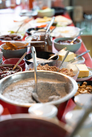 Reichhaltiger Brunch und Kaffee/Tee wird uns von Emely im hauseigenen Café x.tra.zimmer im Erdgeschos serviert.